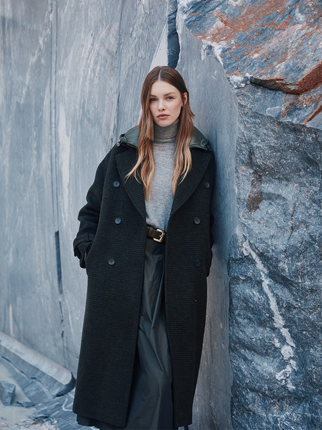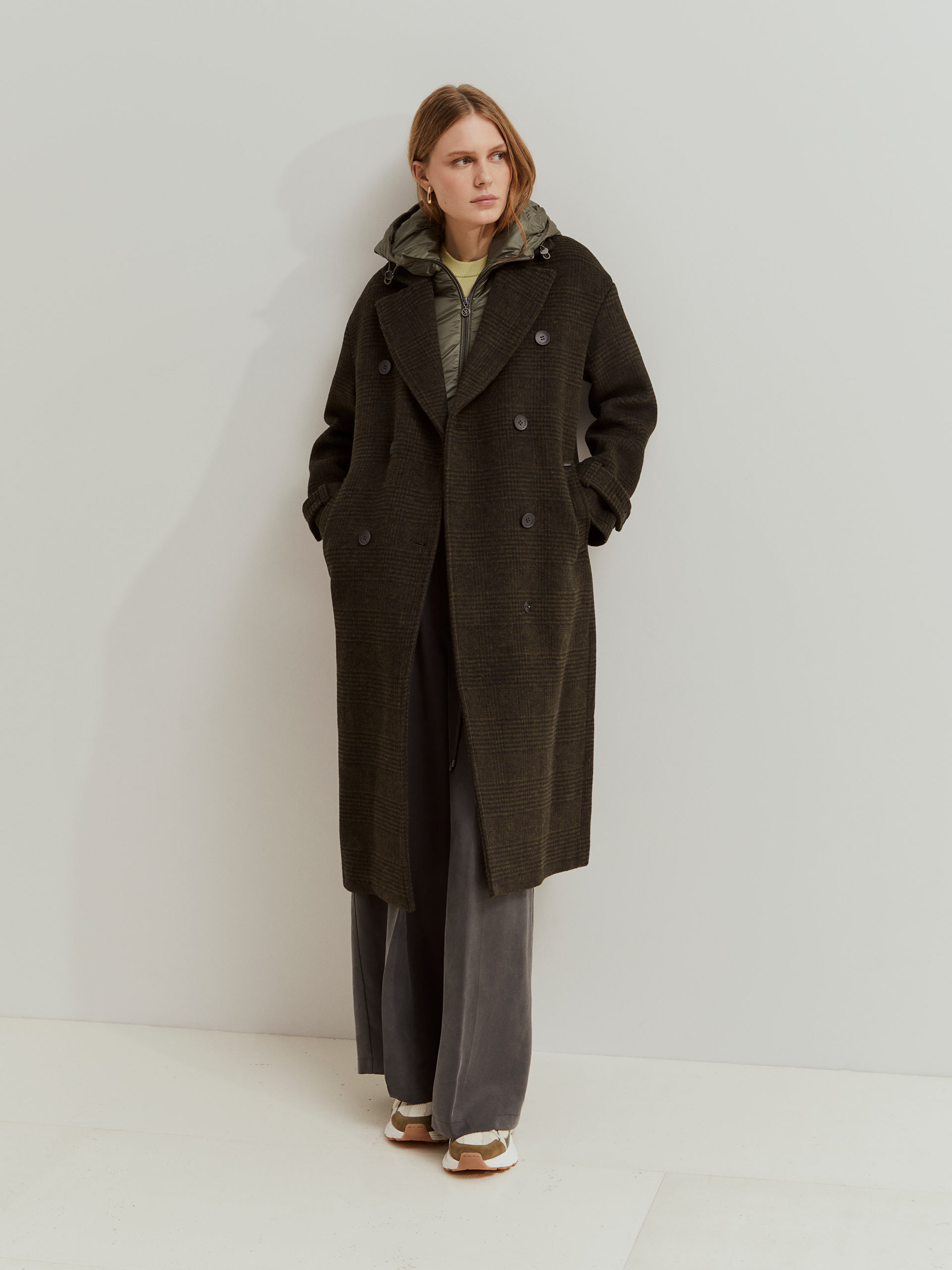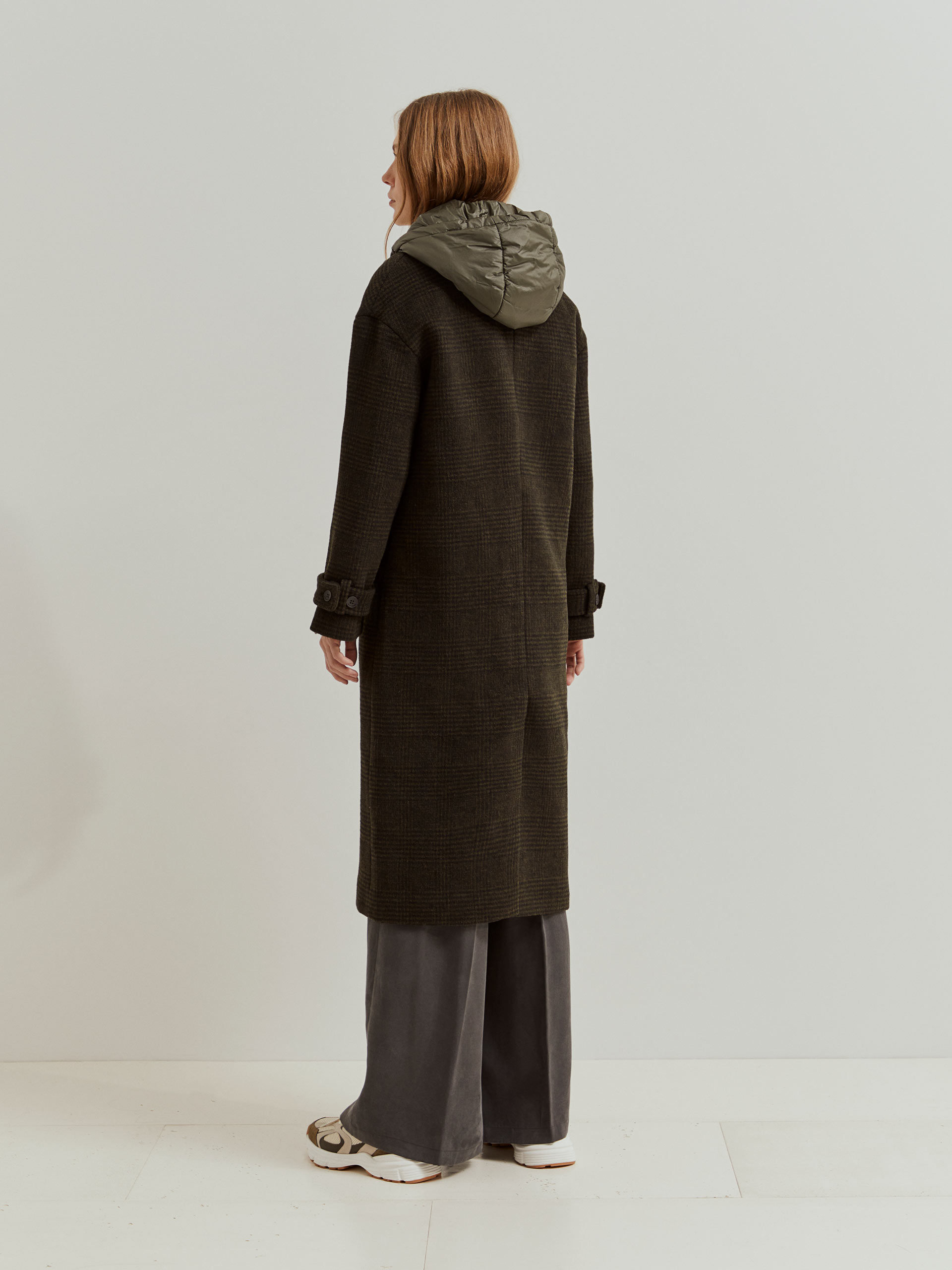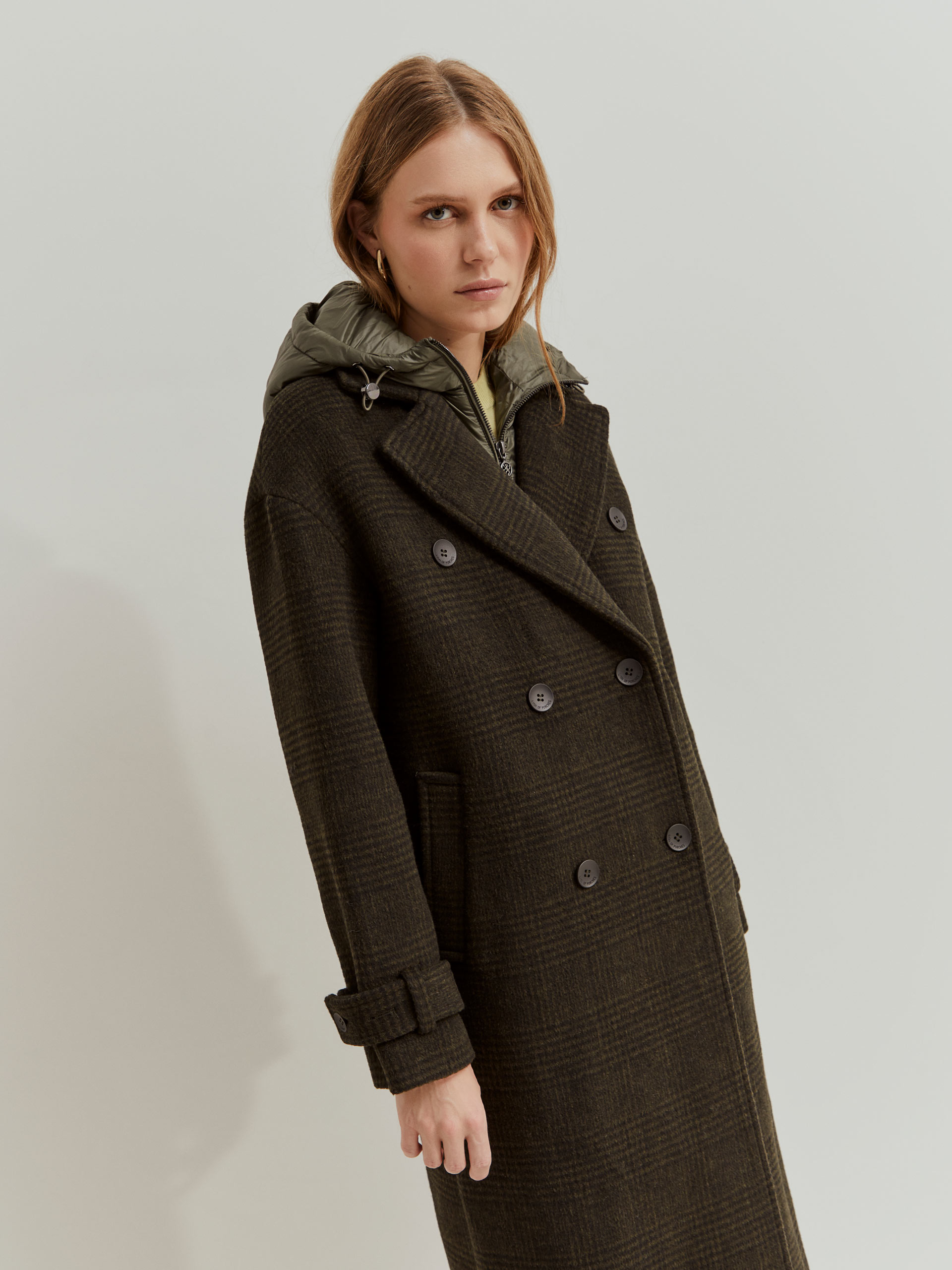 Abrigo de suaves cuadros de lana en verde oscuro y negro con falso chaleco y capucha acolchados extraíbles.