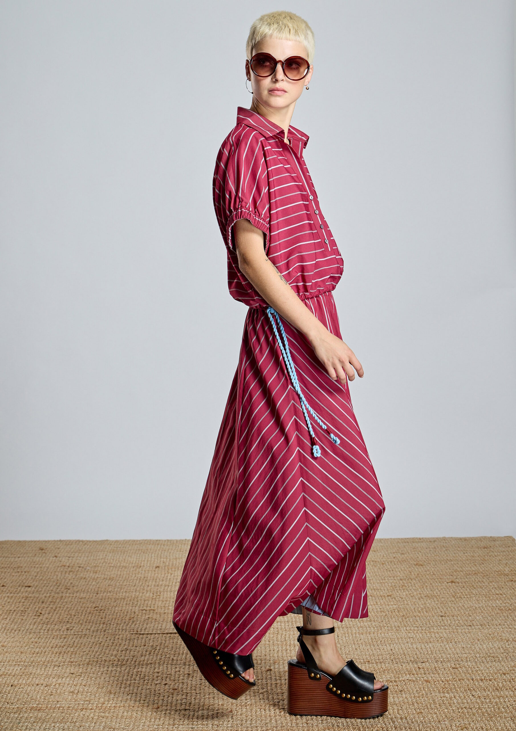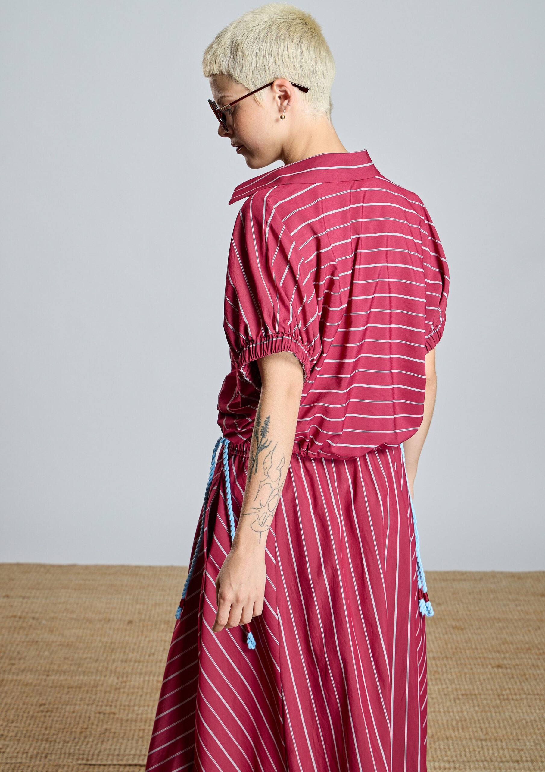 Falda de vuelo tobillera en granate con raya diplomática azul cielo.