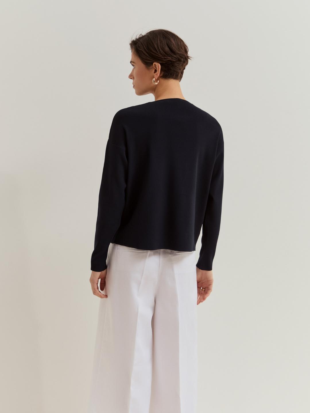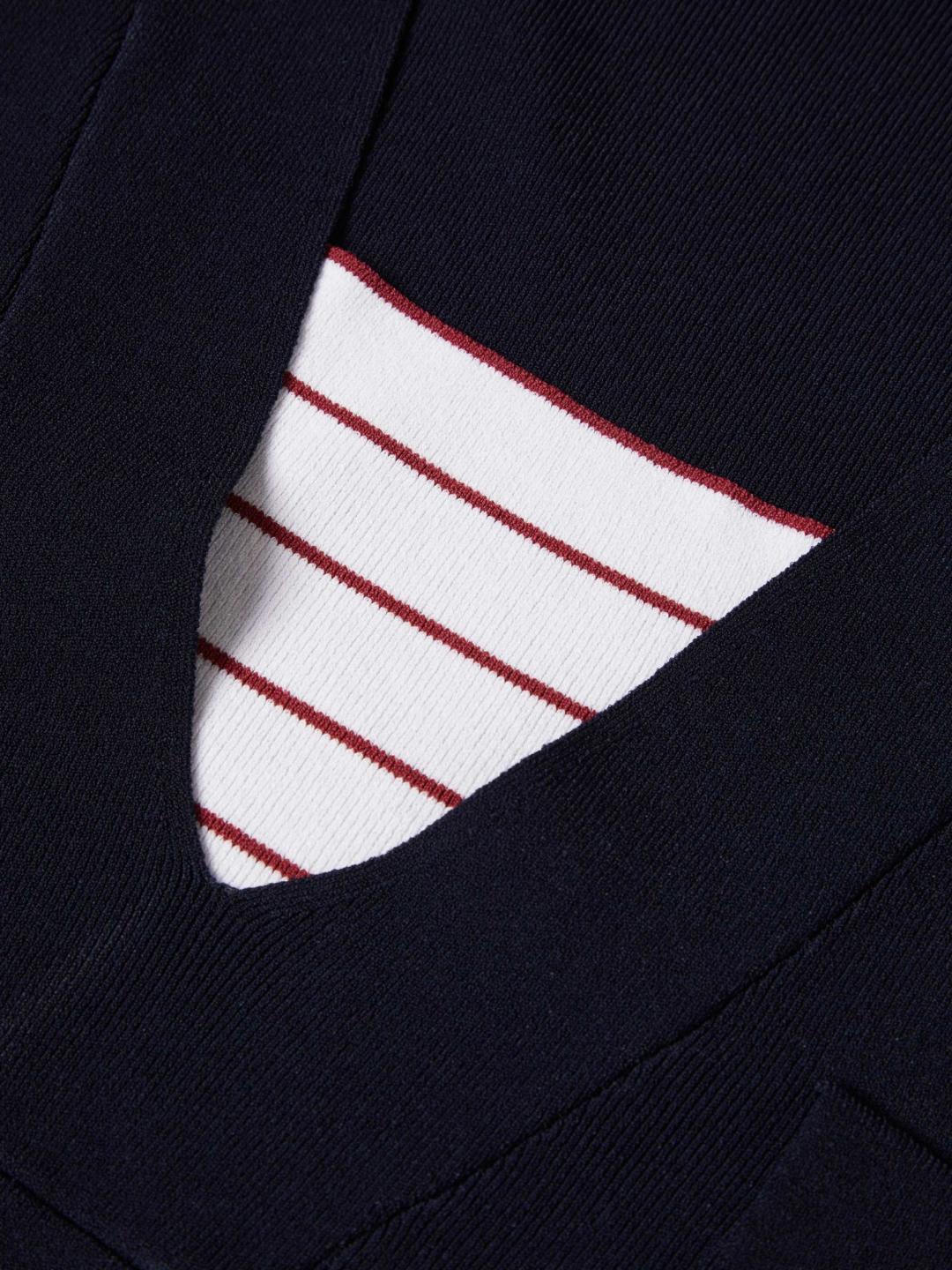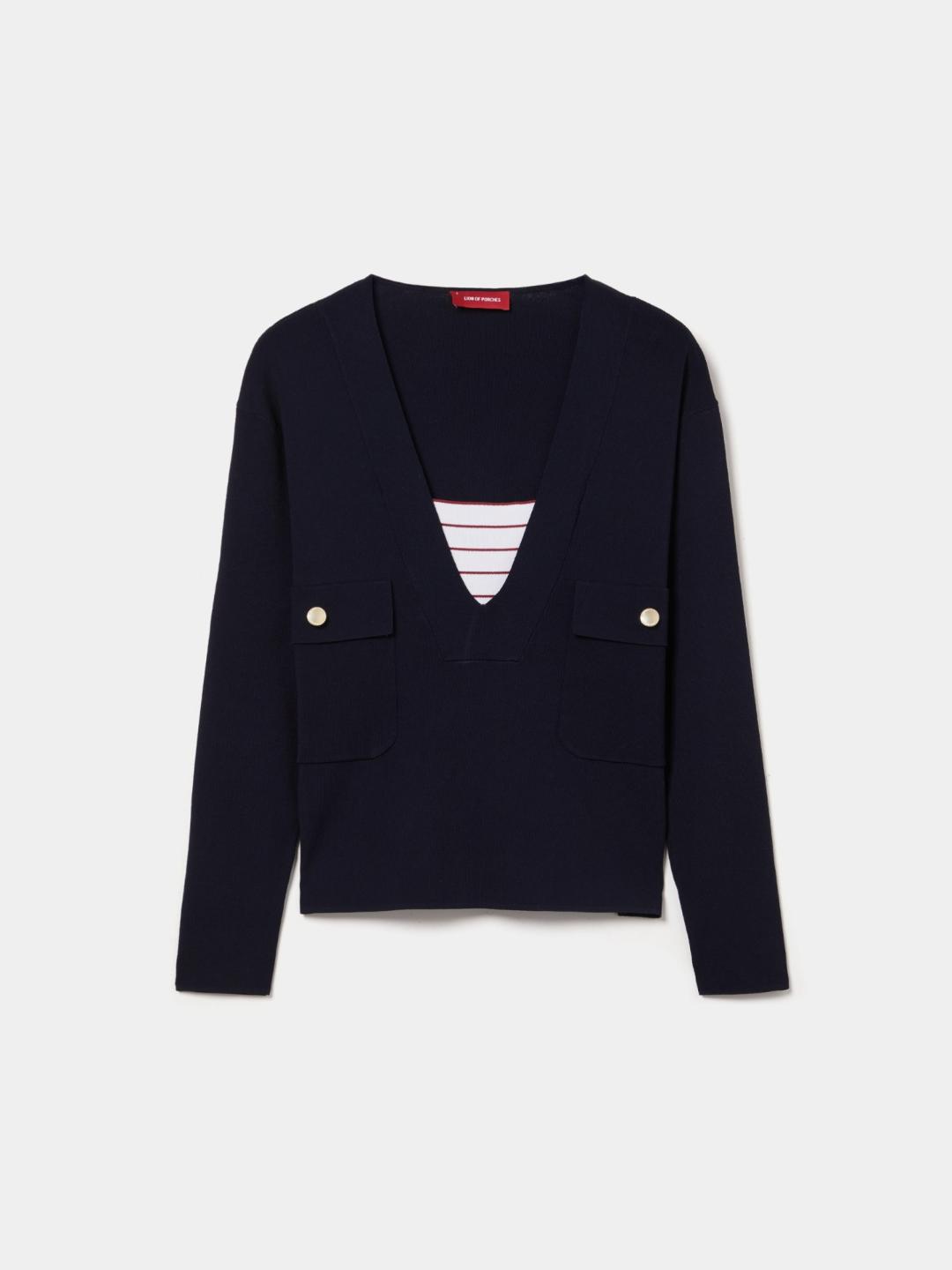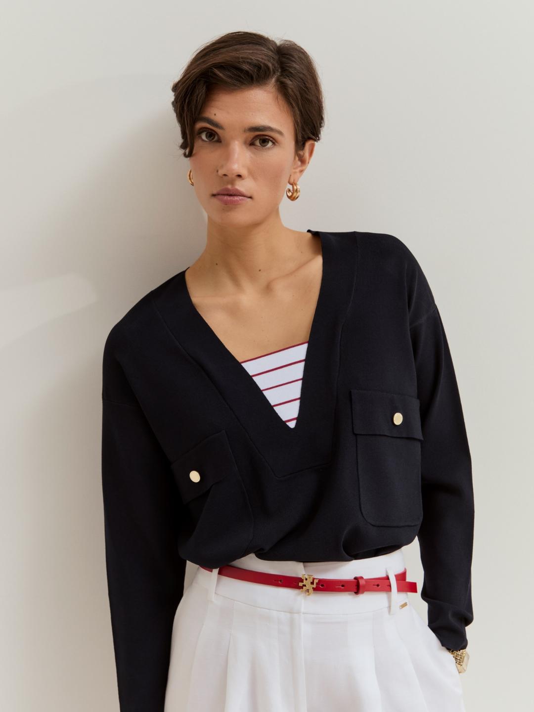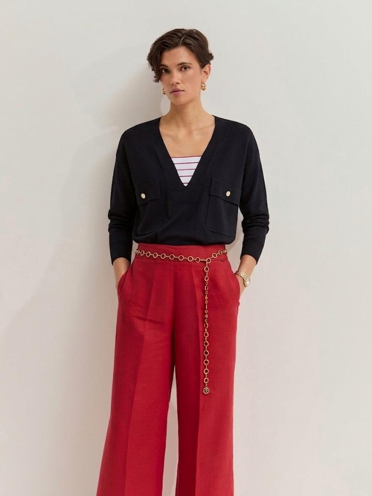 Jersey fino azul marino con pico en color crudo con listas en rojo y bolsillos delanteros, ideal para combinar con pantalón de lino de la misma firma en rojo oscuro.