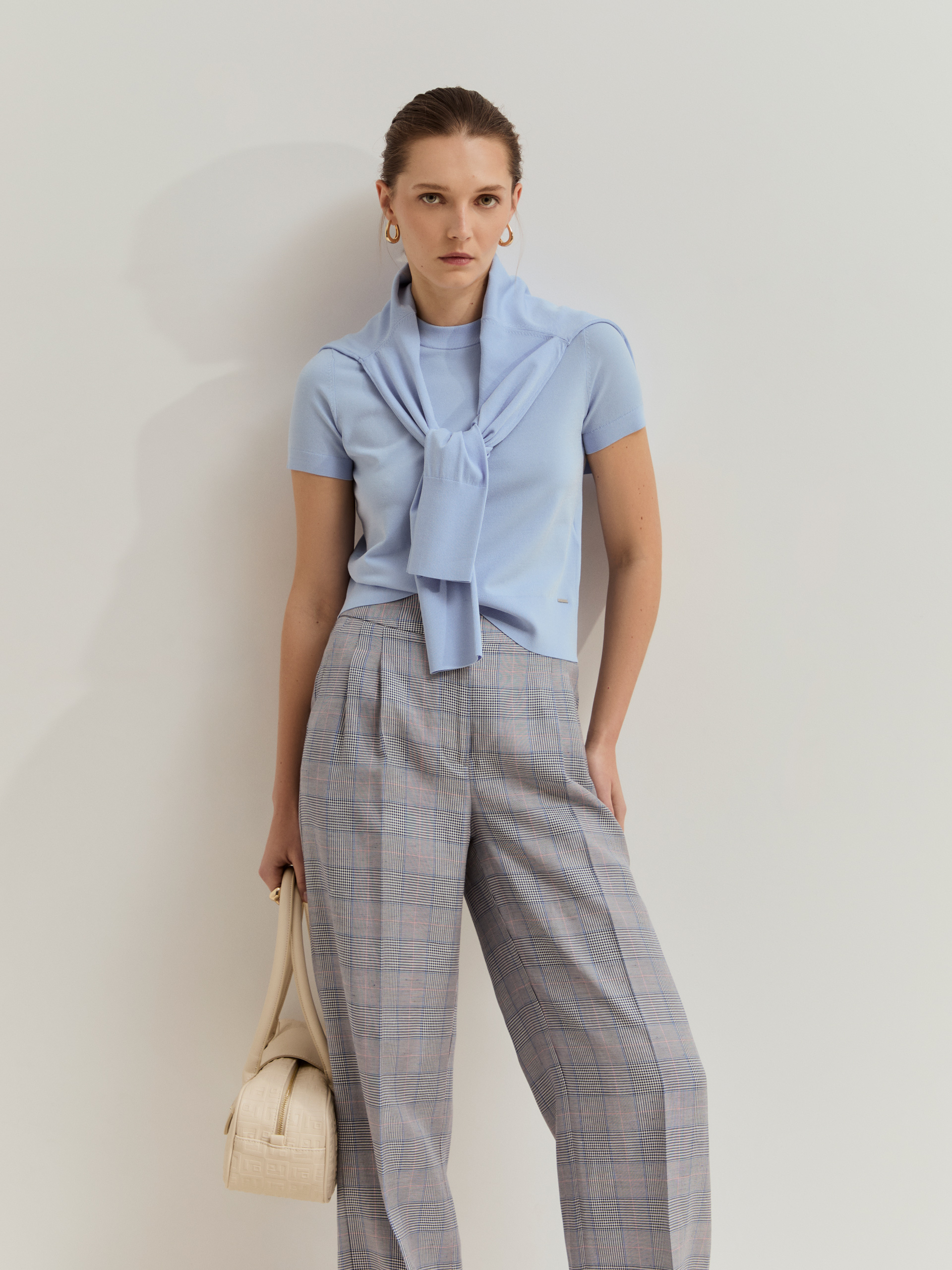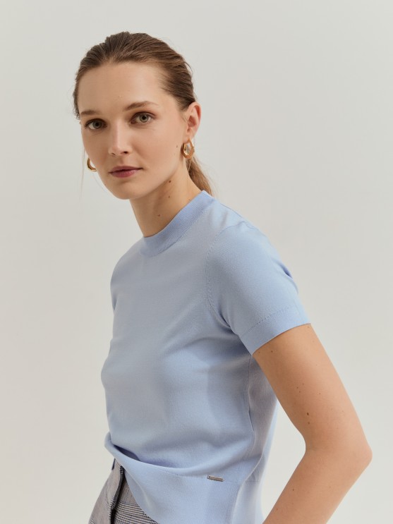 Jersey de punto fino de manga corta y cuello caja ideal para combinar con cárdigan a juego a modo de twin-set.