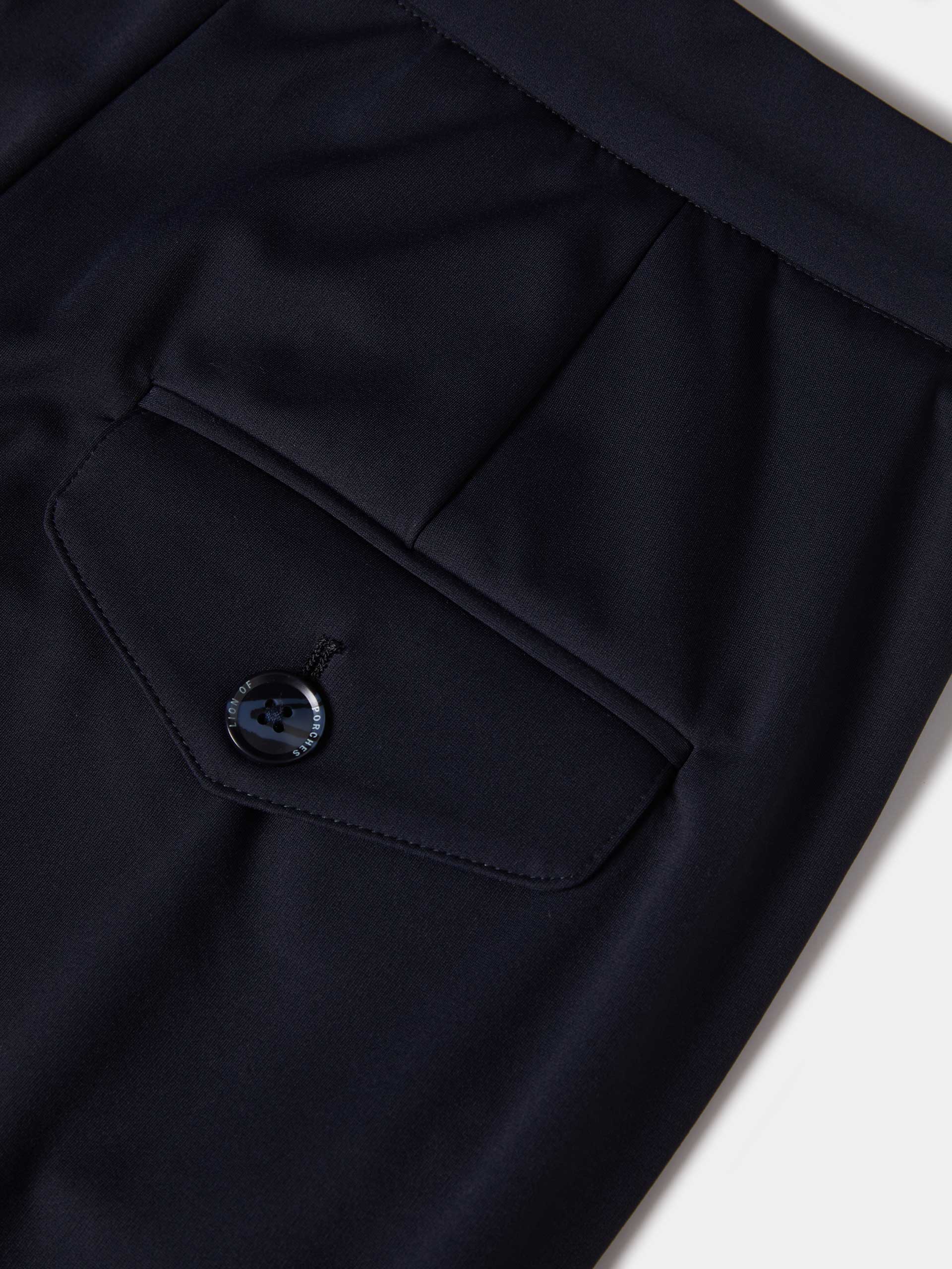 Pantalón chino con pinzas delanteras y bolsillos de tejido elástico en azul marino.