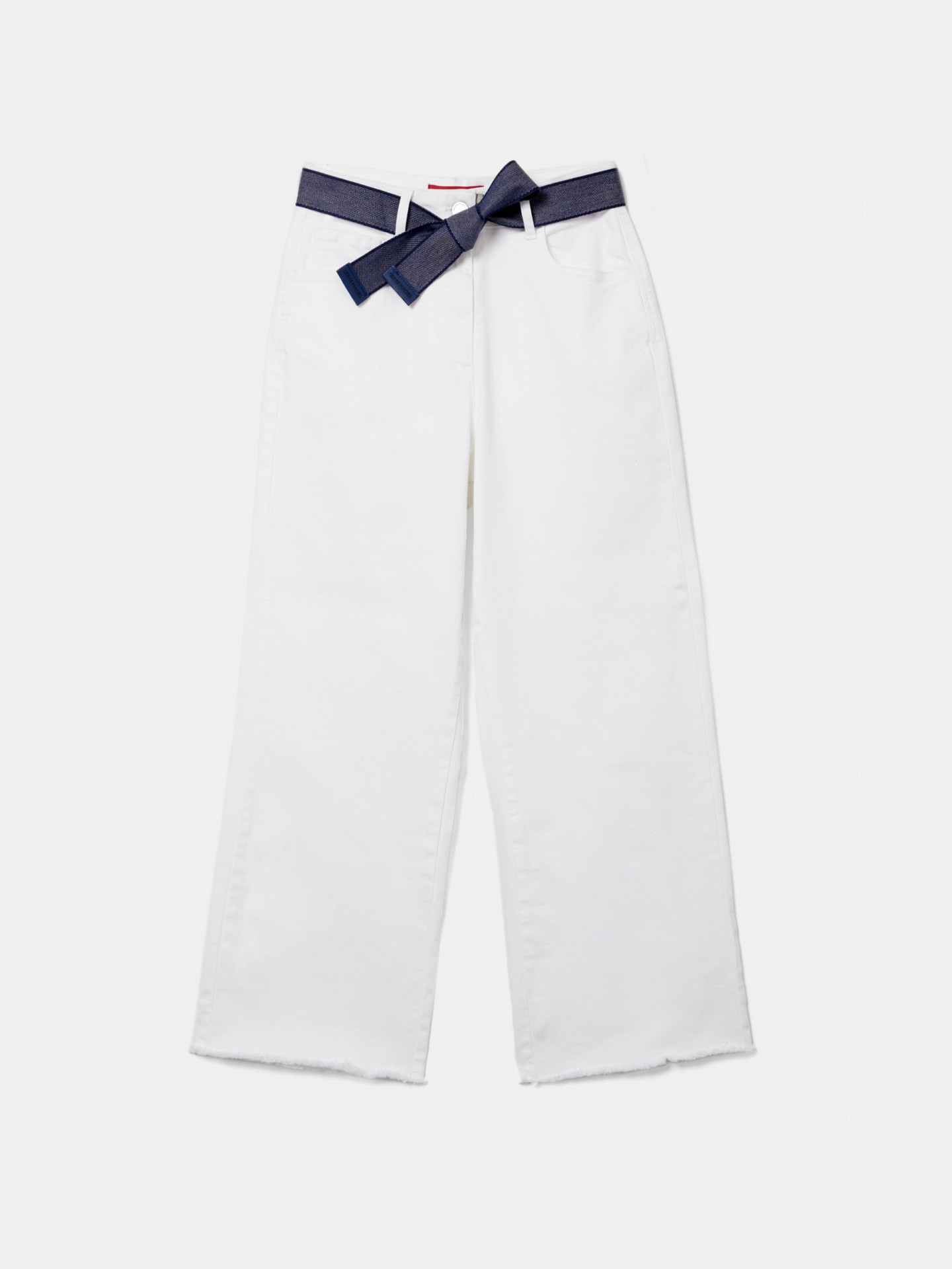 Pantalón de tejido vaquero de pata recta y tiro alto ligeramente desflecado.