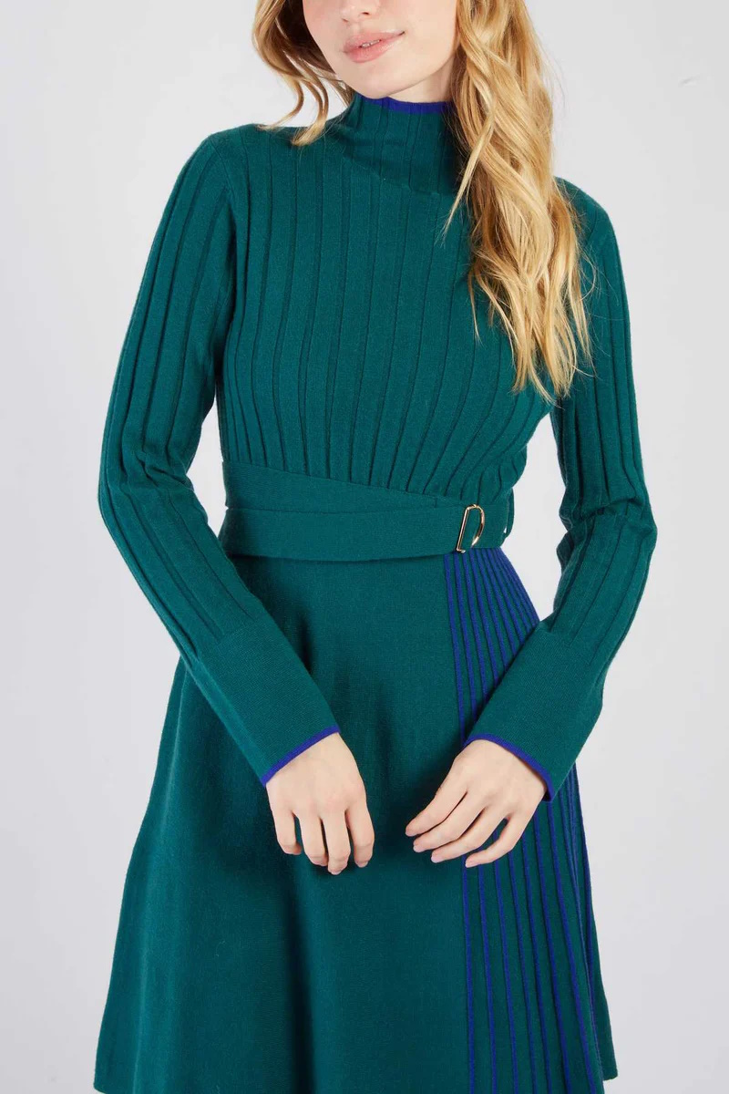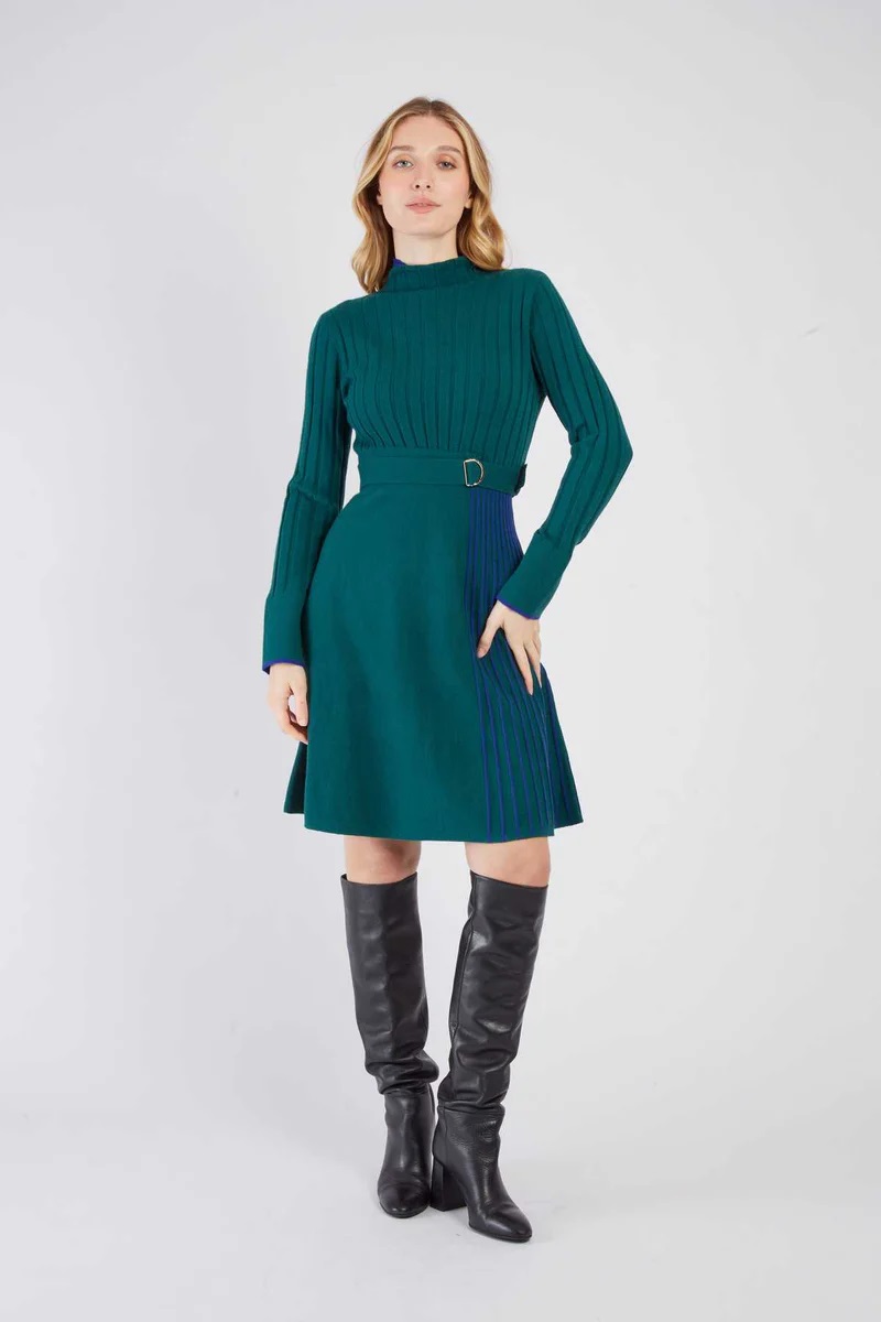 Vestido de punto en verde y azul tinta con falda de ligero vuelo y plisado lateral.