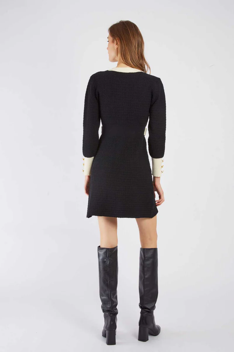 Vestido corto de punto negro de inspiración «chanel» con botones dorados y detalles en beige y lurex.