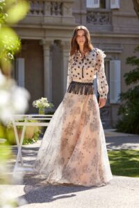 Maravilloso conjunto de fondo beige con detalles en negro; blusa de lunares con mangas ablusadas y falda de vuelo con flores y pasamanería en la cintura. Sin duda una pieza para una invitada de primera bancada que quiera destacar por su elegancia.