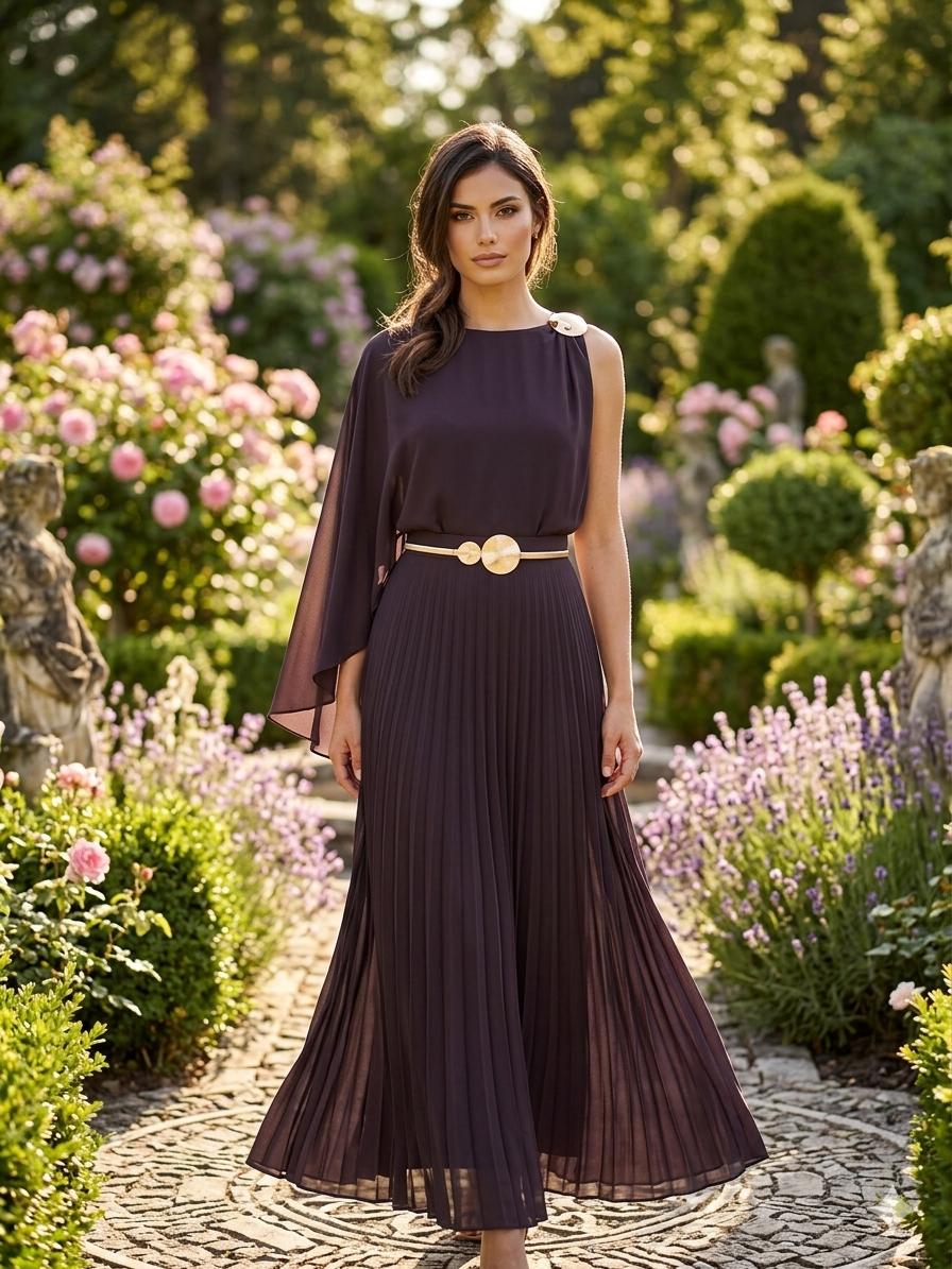 Conjunto super vaporoso de blusa asimétrica con detalle dorado y falda plisada en marrón chocolate super elegante para cualquier evento de día o de noche.