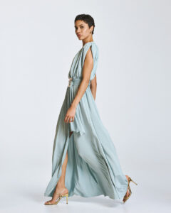 Vestido largo con hombros marcados, escote a pico y cintura ajustada con cinturón con hebilla. Su abertura delantera y su movimiento lo hacen perfecto para graduaciones o eventos de tarde-noche.