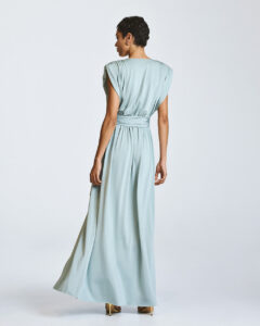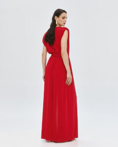 Vestido largo con hombros marcados, escote a pico y cintura ajustada con cinturón con hebilla. Su abertura delantera y su movimiento lo hacen perfecto para graduaciones o eventos de tarde-noche.