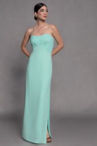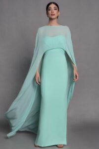 Vestido largo con capa en gasa verde tíffany con cuerpo palabra de honor drapeado .