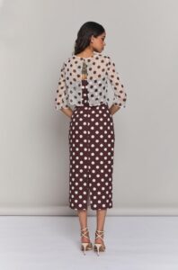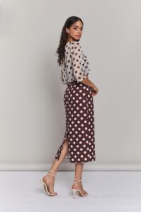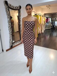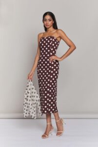 Vestido palabra de honor midi de lunares en marrón chocolate con sobre blusa abrochada atrás con manga francesa.
