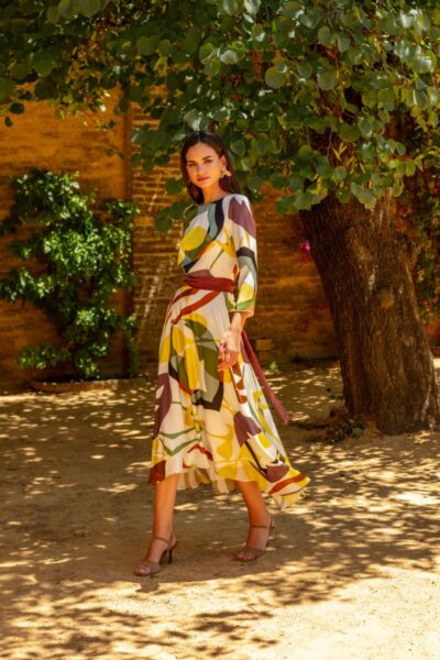 Es el vestido fluído perfecto para eventos en los que quieras ir elegante sin excesos como comuniones o bodas de invitada. Su manga tres cuartos y su falda de vuelo le aporta el estilo que quieres para estas ocasiones.