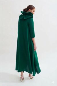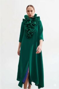 Vestido de crepe en forma de capa con escote de volantes de tafeta y manga francesa, una opción espectacular para una mujer moderna que busque una prenda especial para un evento importante.